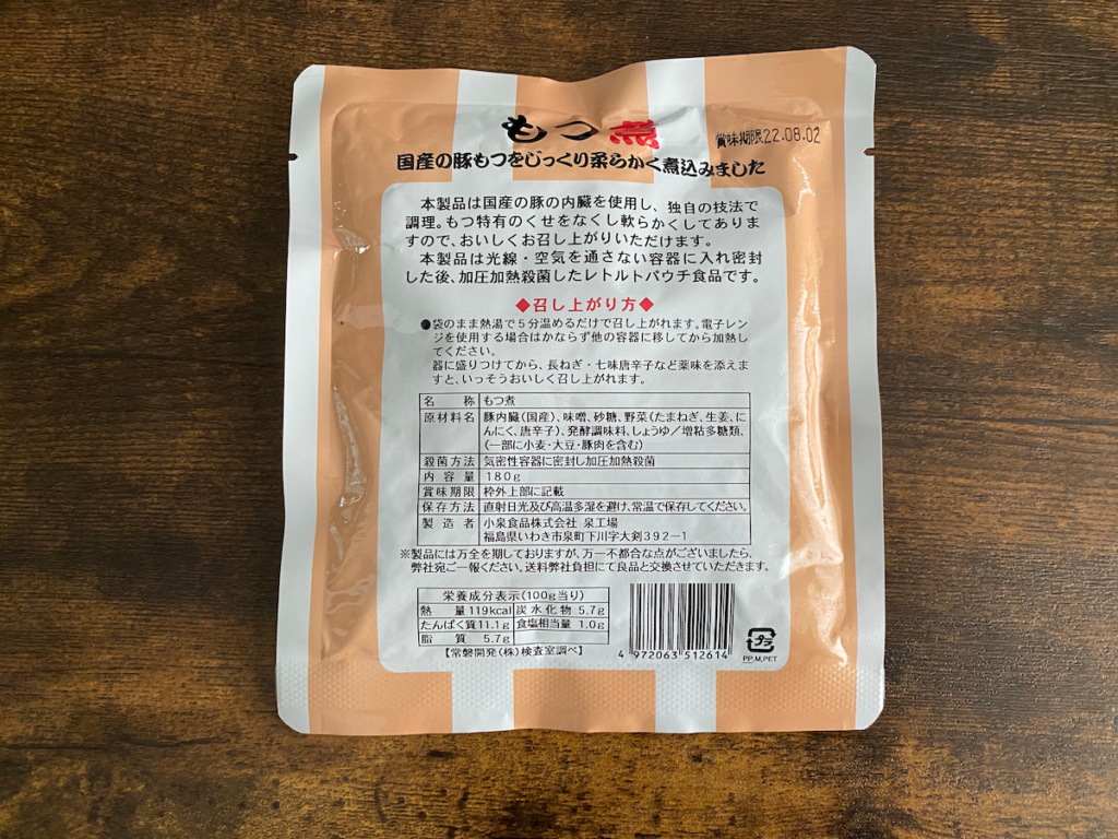こんにゃく屋生田目屋さんのもつ煮です。3回目のリピートかな?つい先日もポチりました。国産の豚もつで1袋180gが3袋入って1000円。あー、今晩のご飯ちょっと寂しいな〜って時に、お湯で温めてプラス一品できちゃうのが楽ちんで嬉しい。