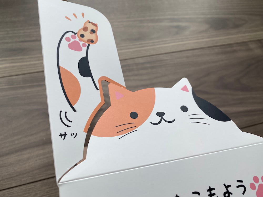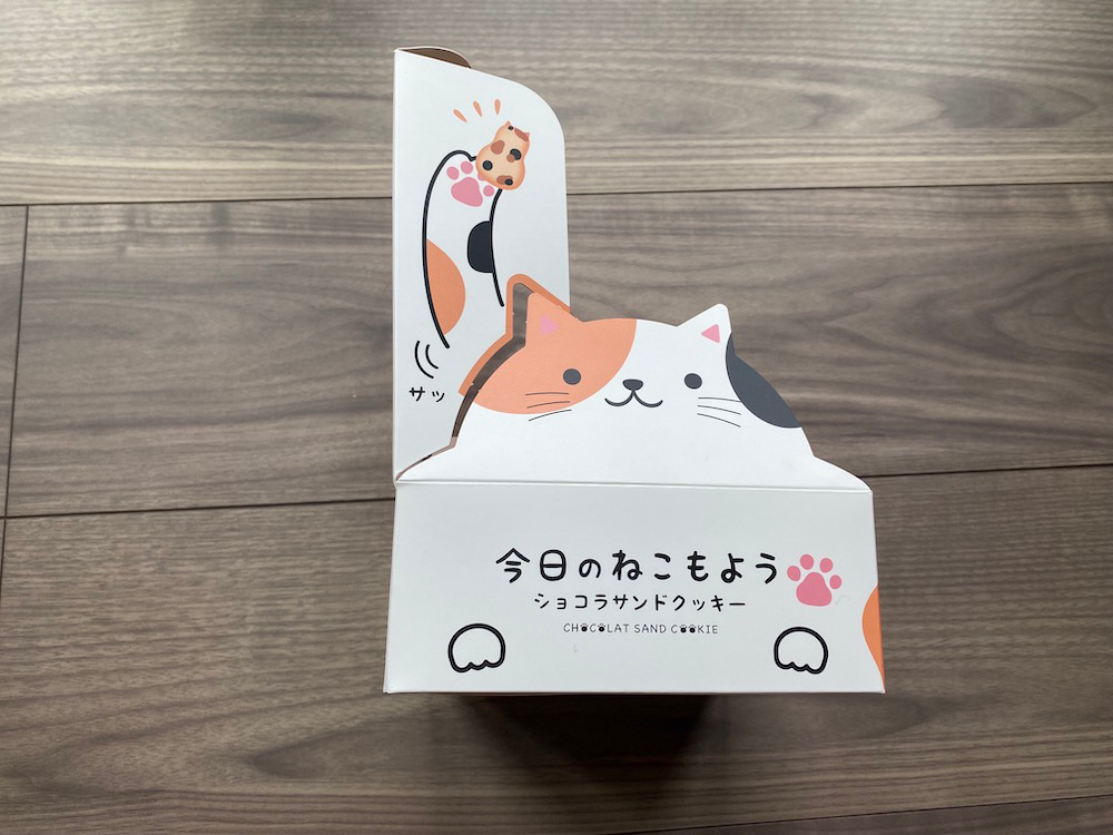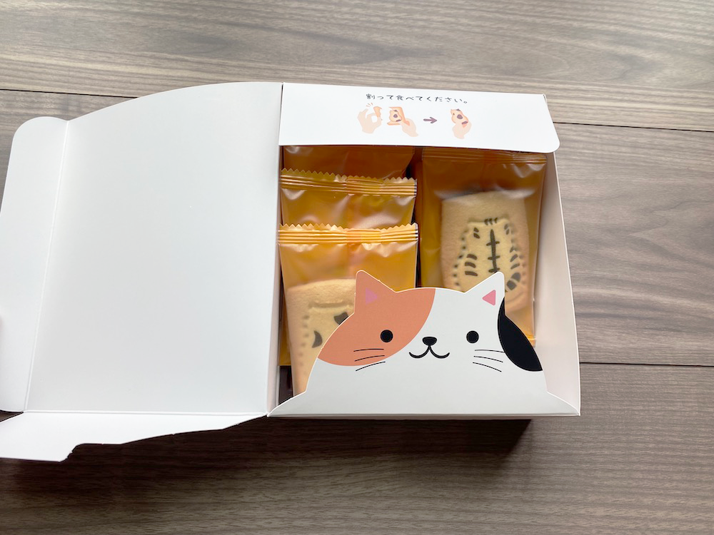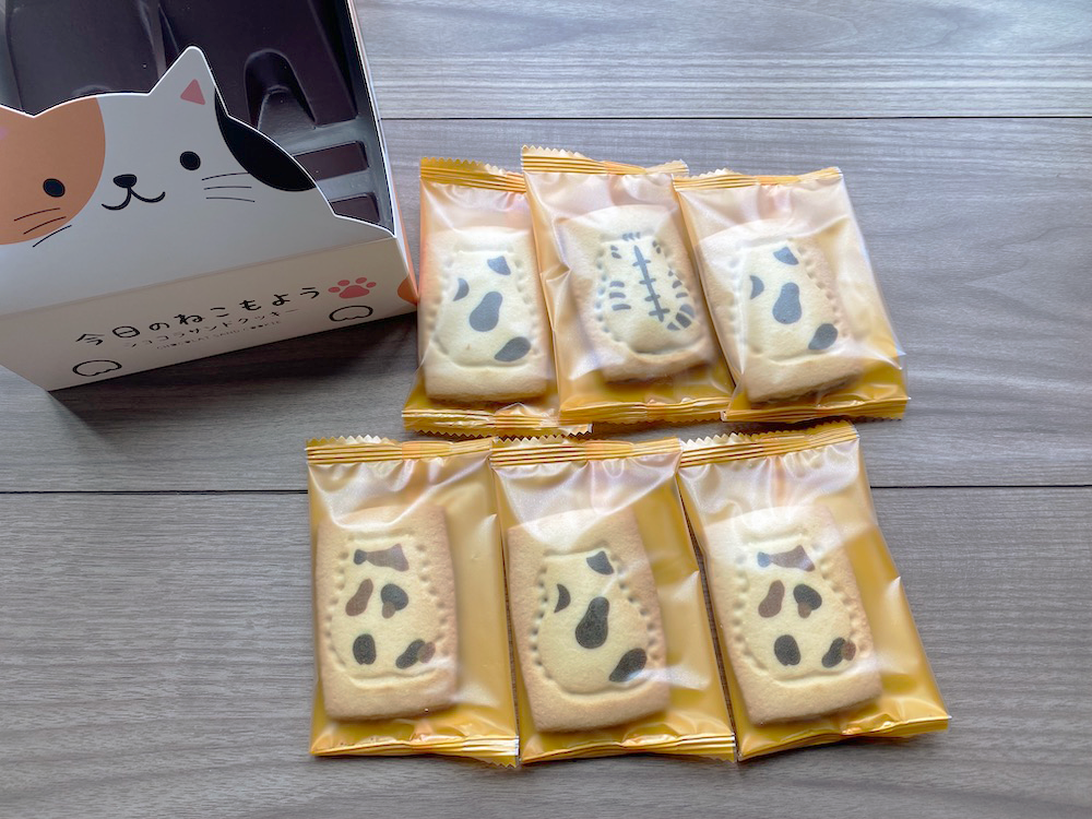 まずこれ。なんだろな?と気になる「今日のねこもよう」というネーミング(商品名)。お土産売場には沢山の土産品が並んでいるのでどうやって目を引くかが大事ですよね。このネーミングは気になっちゃいます。猫は気まぐれなんて聞きますけど「ねこ模様」じゃなく「ねこもよう」と平仮名表記にしたことで、猫のそんな愛らしさも連想されます。